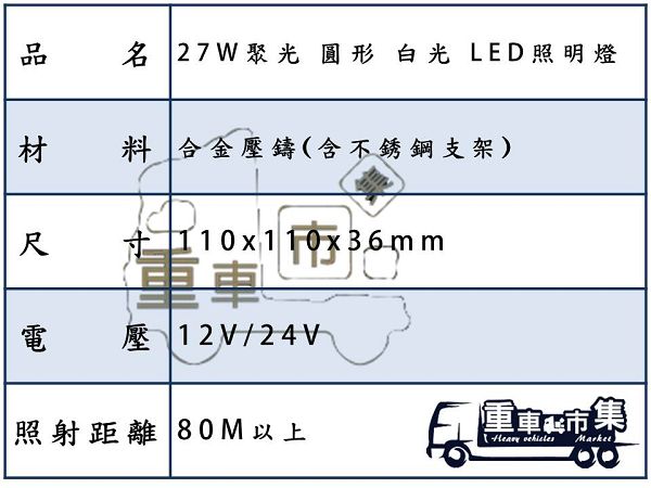 [重車市集] 27W 聚光 圓形 白光 LED照明燈 輔助照明燈 探照燈 投射燈 霧燈